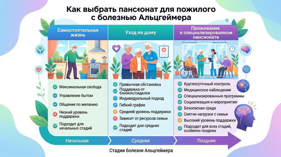 Начинайте выбор с оценки стадии Альцгеймера, уровня самостоятельности и подходящего формата размещения — так вы быстрее найдёте пансионат, который обеспечит безопасность, уход и комфорт вашему близкому.